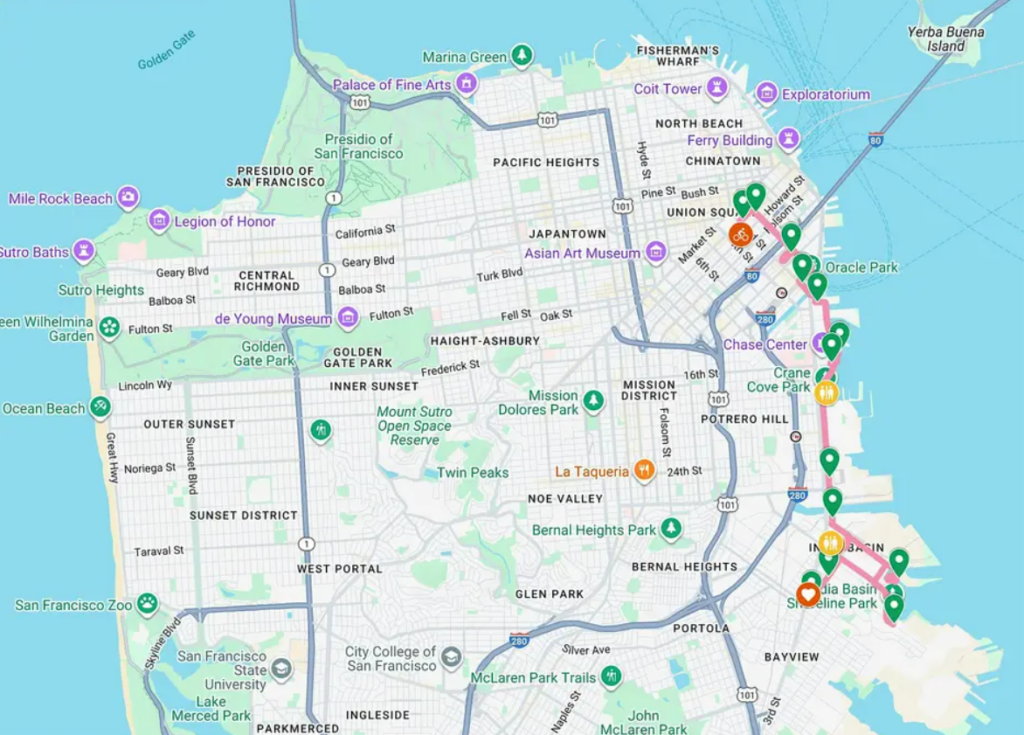 The map below shows the route of the ride, from the MLK Memorial Foundation in Yerba Buena down the eastern waterfront to the South East Community Center, stopping at iconic highlights like the Oracle Park’s bronze Willie Mays statue and the Toni Stone Crossing.